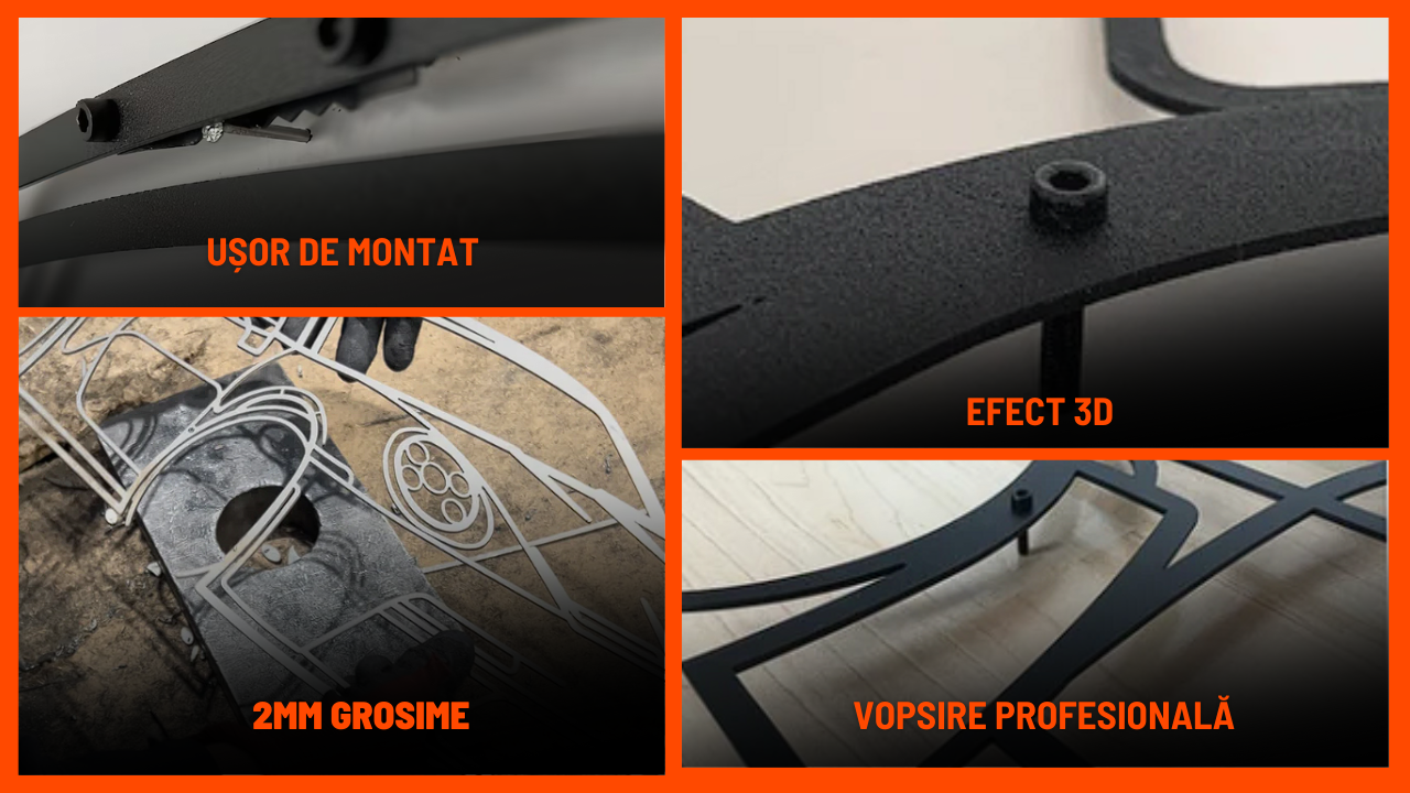 Fiecare siluetă metalică este realizată din oțel de 2 mm, tăiată cu precizie laser pe mașini CNC.
